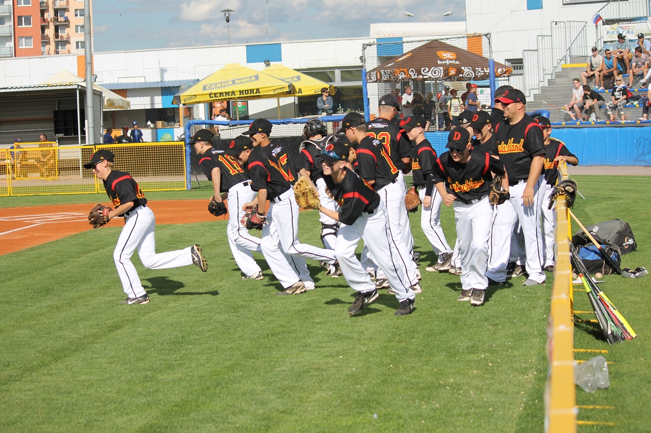 Mental von Headcoach Bull hervorragend eingestellt und von Beginn an hellwach ging die Deutsche U12 in das erste Spiel gegen Russland. Noah Lindt bekam das Vertrauen der Coaches und legte gleich mal mit platzierten Strikes in Serie los. Zwei Flyouts durch den sicheren Rightfielder Paul Schmitz und ein Routine Play von Tim Luca Lindemann am zweiten Base führten zu einem schnellen 1,2,3 Inning zum Auftakt.