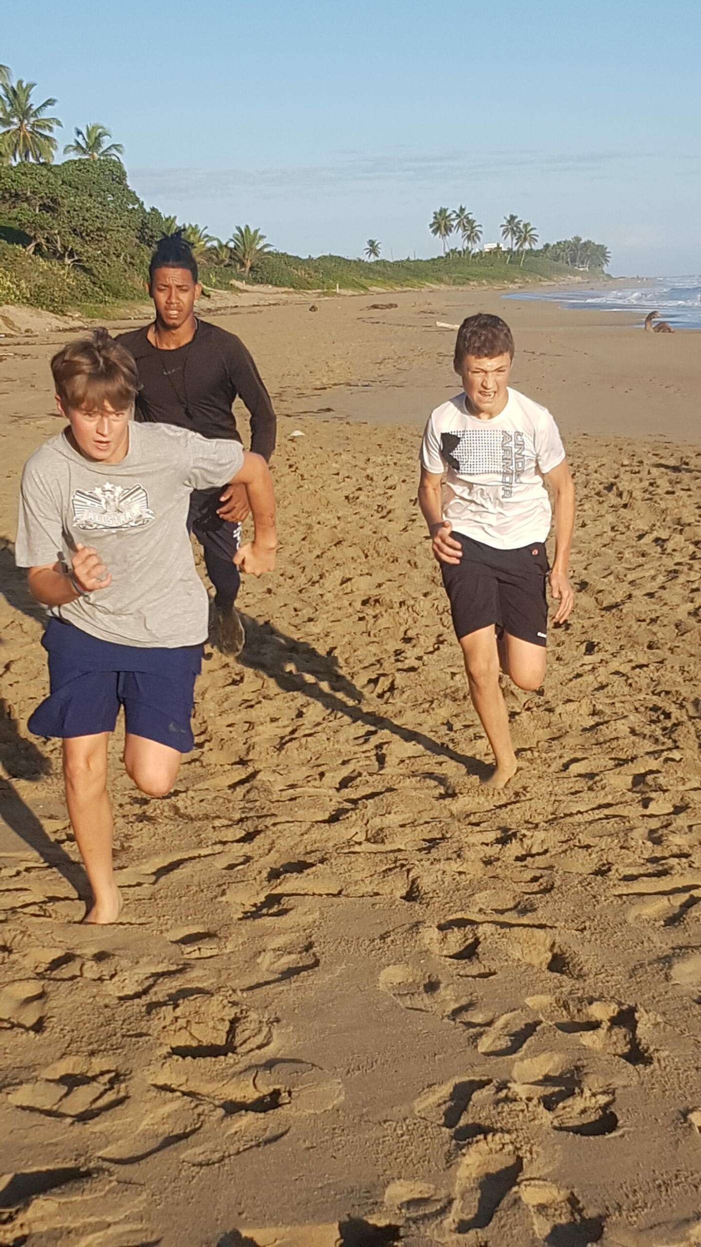 Heute morgen gab es hartes, aber effektives und schönes Strandtraining am einsamen Karibikstrand, gefolgt von einer kleinen Baderunde, die ich den Jungs gegönnt habe, denn Jonelfry, der Fitnesstrainer, hatte bisher Angst, dass sie in den Wellen untergehen.