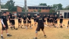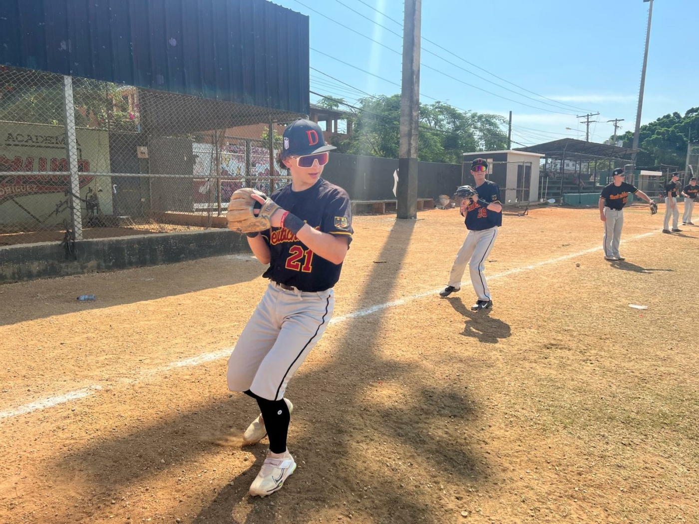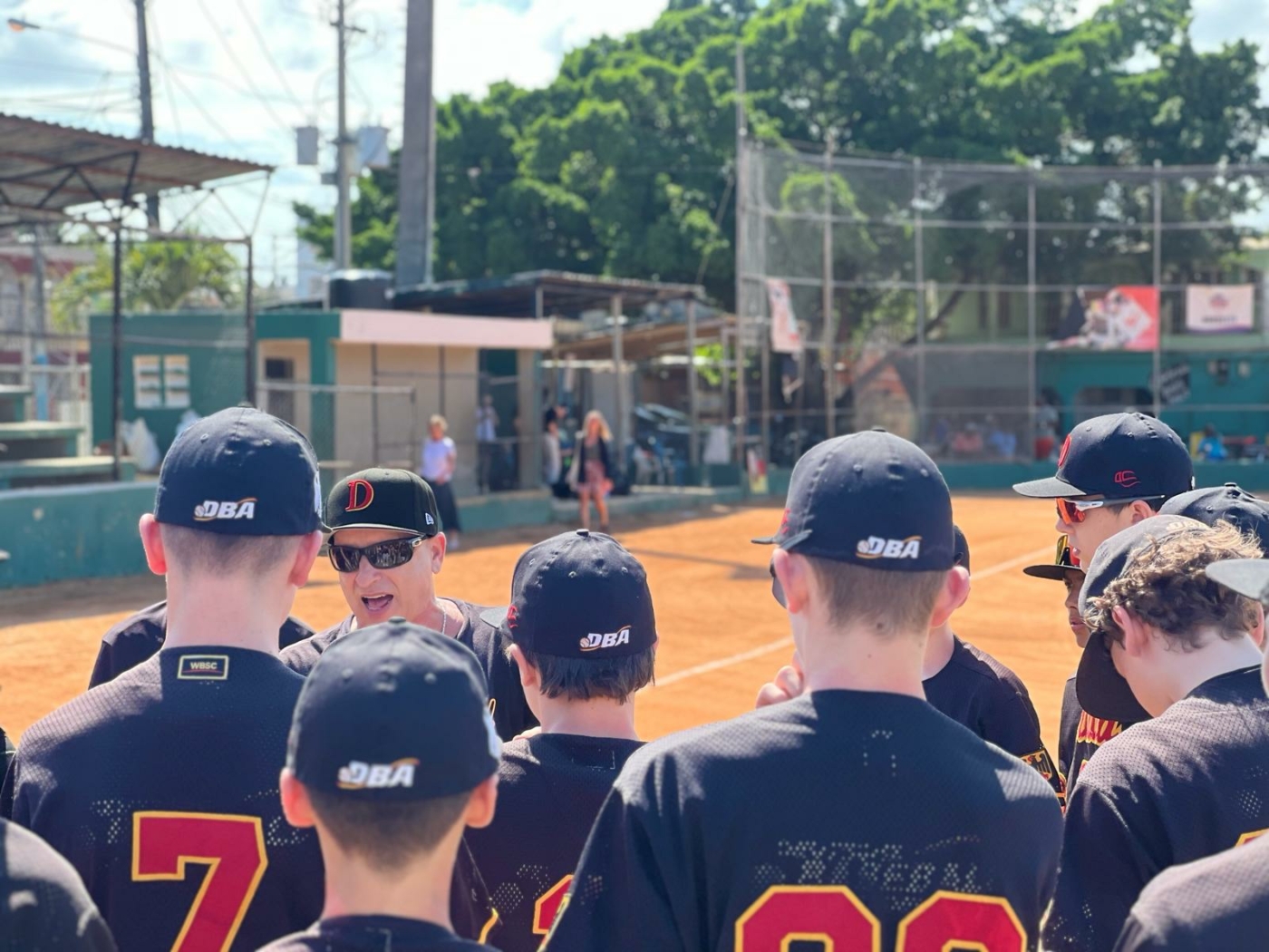 Am nächsten Morgen um 7:30 Uhr begannen wir gleich mit dem traditionellen Beach-Workout, wo die Jungs mit Hingabe ihre Run-Tool verbesserten. Nach einem reichhaltigen Frühstück und einer kurzen Pause ging es dann weiter zum Morgentraining im Estadio de Béisbol Juan Alberto Ozoria, wo der Schildwall hart an unserer Technik feilte und sich auf den Wettkampf vorbereitete. Neben dem DBA Tross um Georg Bull, Heiko Schumacher, Octavio Medina und Dominik Buder waren auch regionale Spieler- und Trainerstars um Nate Trosky, Ezequiel Rodriguez (ehemals bei den NY Yankees), Ariel, Sabriel Polanco und Trainer Napoleon Calzado, oft liebevoll als “Napi” bezeichnet, welcher über einen Zeitraum von mehr als 10 Jahren bis 2006 hinweg professionell Baseball spielte und sogar kurze Auftritte bei den Orioles in der Major League hatte. Mit so viel Baseballprominenz lief alles wie am Schnürchen, und wir trainierten in drei Gruppen bei der brennenden Hitze der Dominikanischen Republik, immer mit dem Motto im Kopf: “Hart arbeiten, um zu siegen”.